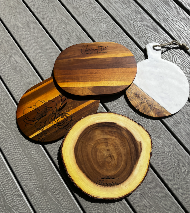 Using a combination of laser engraving and heat transfer techniques, we applied the client's logo to charcuterie boards, aprons, and t-shirts, ensuring consistent branding across all items. Additional live edge charcuterie boards were customized with bespoke quotes and designs to enhance the display's visual appeal.